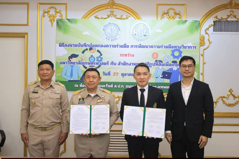 นายเศรษฐเกียรติ กระจ่างวงษ์ เลขาธิการสำนักงานการปฏิรูปที่ดินเพื่อเกษตรกรรม (ส.ป.ก.) พร้อมด้วย ผู้ช่วยศาสตราจารย์วิศิษฐ์ ลิ้มสมบุญชัย คณะบดีคณะเศรษฐศาสตร์ มหาวิทยาลัยเกษตรศาสตร์ เซ็นบันทึกข้อตกลงความร่วมมือ การพัฒนาความร่วมมือทางวิชาการ ระหว่าง มหาวิทยาลัยเกษตรศาสตร์ กับ สำนักงานการปฏิรูปที่ดินเพื่อเกษตรกรรม ในวันที่ 27 ตุลาคม 2568 ณ ส.ป.ก. ถนนประดิพัทธ์ กรุงเทพมหานคร