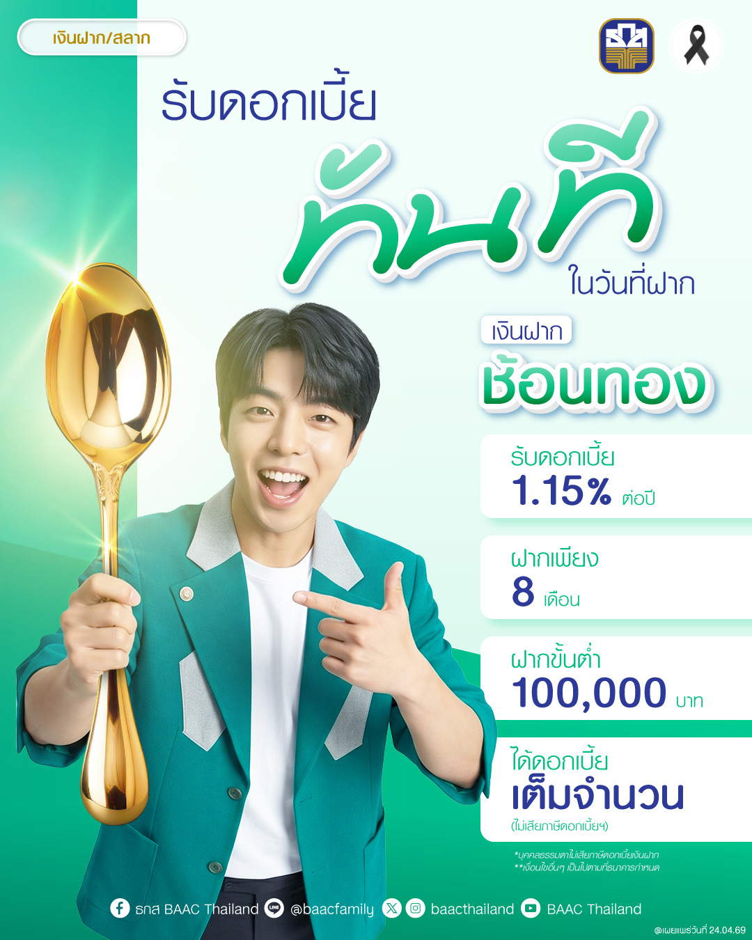 นายไพศาล หงษ์ทอง รองผู้จัดการธนาคารเพื่อการเกษตรและสหกรณ์การเกษตร (ธ.ก.ส.) เปิดเผยว่า เพื่อเป็นการสร้างทางเลือกทางการเงินและเสริมสร้างวินัยทางการเงินให้แก่เกษตรกรลูกค้าและประชาชนทั่วไปอย่างยั่งยืน ธ.ก.ส. ชวนฝากเงินกับเงินฝากช้อนทอง เงินฝากระยะสั้นที่ให้ผลตอบแทนคุ้มค่า และตอบโจทย์ไลฟ์สไตล์ทางการเงินของลูกค้า โดยมีเงื่อนไขดังนี้ บุคคลธรรมดาที่มีอายุตั้งแต่ 7 ปีบริบูรณ์ขึ้นไป หรือกลุ่มบุคคล นิติบุคคล ส่วนราชการ รัฐวิสาหกิจ สถาบันการเงินและบริษัทประกันภัย เมื่อฝากเงินขั้นต่ำ 100,000 บาท รวมสูงสุดไม่เกิน 100 ล้านบาทต่อราย จ่ายดอกเบี้ยเงินฝากล่วงหน้า ณ วันที่ฝากเงิน ร้อยละ 1.15 ต่อปี ระยะเวลาฝาก 8 เดือน ฝากวันไหนก็ได้รับดอกเบี้ยครบ 8 เดือน ไม่มีค่าธรรมเนียมในการถอนเงินฝากก่อนครบกำหนด และเมื่อครบกำหนดระยะเวลาในการฝาก ธนาคารจะโอนต้นเงินเข้าบัญชีเงินฝากคู่โอนในวันครบกำหนด โดยไม่ต้องเสียเวลาติดต่อธนาคาร ทั้งนี้ สำหรับบุคคลธรรมดาไม่เสียภาษีดอกเบี้ยเงินฝาก ได้รับดอกเบี้ยเต็มจำนวน ฝากได้เลยตั้งแต่วันนี้ถึง 31 พฤษภาคม 2569 หรือธนาคารแจ้งปิดการรับฝาก ณ ธ.ก.ส. ทุกสาขาทั่วประเทศ