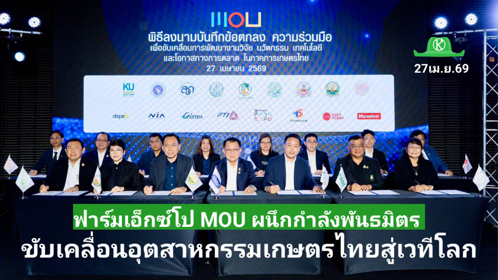 ฟาร์มเอ็กซ์โป ผนึกกำลังภาคีเครือข่ายด้านการเกษตรจากภาครัฐ ภาคเอกชน รวมถึงสถาบันการศึกษา ลงนามบันทึกข้อตกลงความร่วมมือ (MOU) ครั้งสำคัญ เพื่อขับเคลื่อนการพัฒนาธุรกิจ เทคโนโลยี ตลอดจนการตลาดในอุตสาหกรรมเกษตรไทยอย่างครบวงจร มุ่งเชื่อมโยงองค์ความรู้ งานวิจัย ต่อยอดสู่นวัตกรรมเพื่อการใช้งานจริง ครอบคลุมในเชิงพาณิชย์ พร้อมยกระดับศักยภาพเกษตรกรไทย ควบคู่การเพิ่มขีดความสามารถในการแข่งขันบนเวทีโลกอย่างยั่งยืน